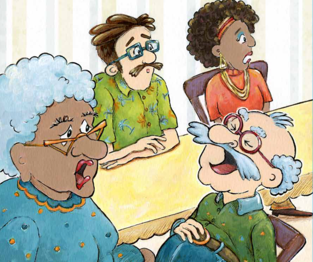 Every Sunday evening the Goodpudding family gathered for dinner around Great Aunt Gladdie’s table. Everyone agreed that Gladdie’s pie was the best part of the meal. But which kind of pie should Gladdie make? Apple? Blueberry? Cherry with a criss-cross crust? On that the Goodpuddings could never agree. So, every Sunday a fight broke out. A foot-stomping, table-thumping, shake-the-chandelier rhubarb! It was a tradition.